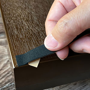 滑り止めテープをドイツ箱の貼る位置に乗せて、長さと貼る位置を確認します。標本棚をご利用されている場合は、標本箱が乗る桟にテープが当たらないように、標本箱の左右端2.5cmはテープを貼らないようにテープを短めに切ります。 |